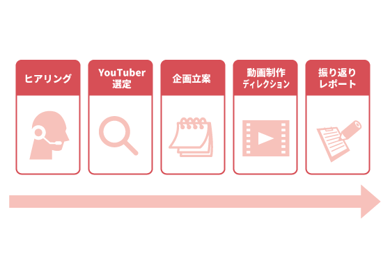 当社では、YouTuberの選定から企画立案、動画制作のディレクション、そして実施後の振り返りレポートの作成まで、すべてワンストップで実施しています。
