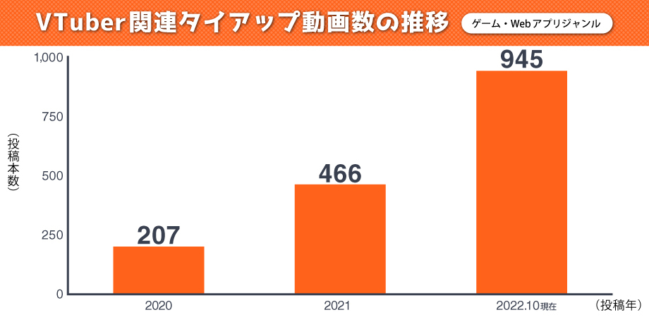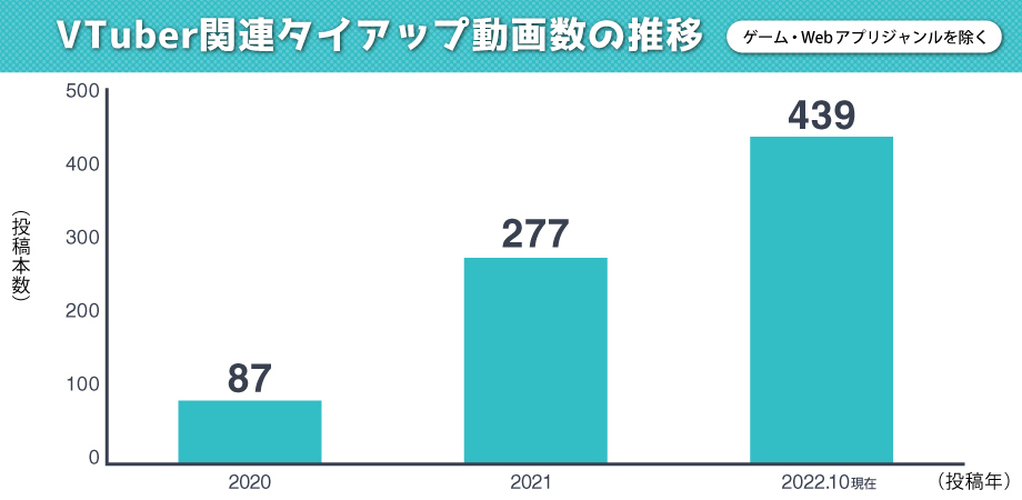 図3図4を見てわかるように、VTuberを活用した企業のプロモーション事例は増加傾向にあり、今後も増加していくことが予想されます。VTuberとの親和性が高いゲームやWebアプリジャンルのタイアップ案件数はもちろんのこと、それ以外のジャンルにおいても年々案件数は右肩上がりとなっています。