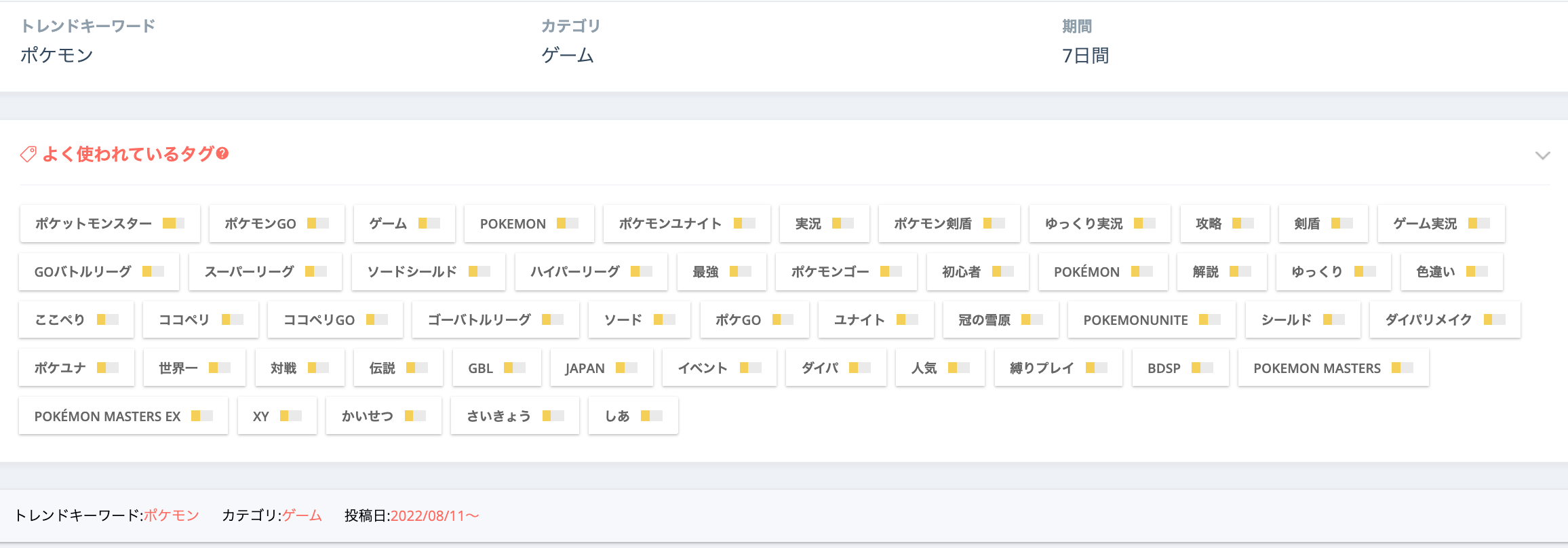 タグの横にある黄色のバーが長いほど、そのキーワードを含む動画にタグ付けされた動画数が多く、バーが短いほど動画数が少なくなっています。