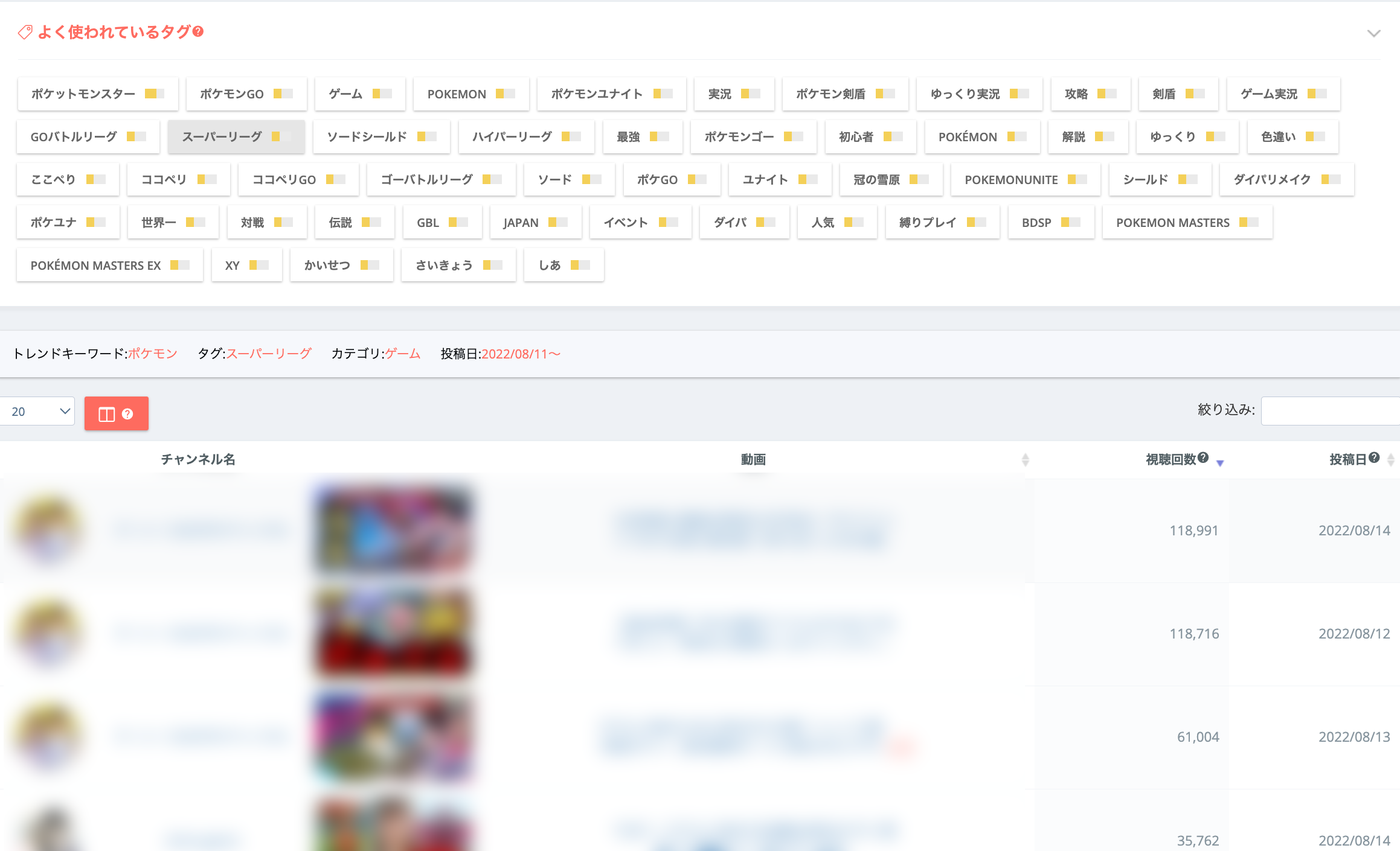絞り込んだ結果(「ポケモン」というキーワードを含む動画の中で「スーパーリーグ」というタグをつけた動画の視聴回数順)