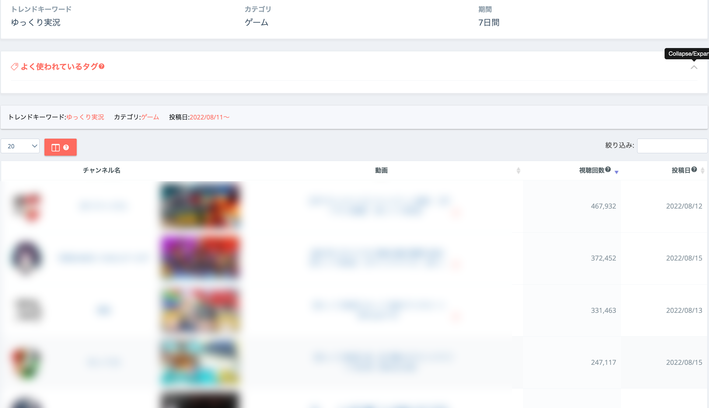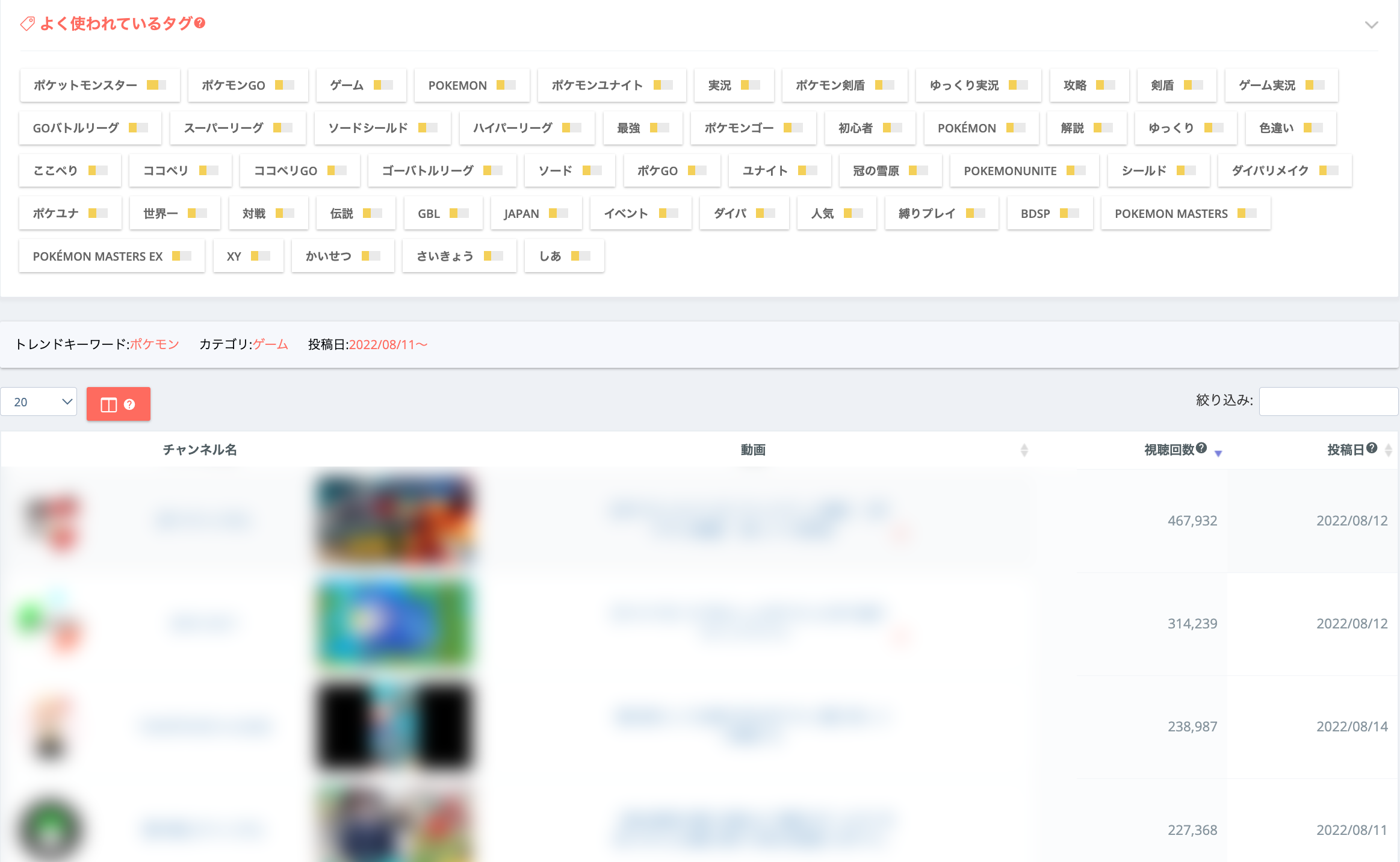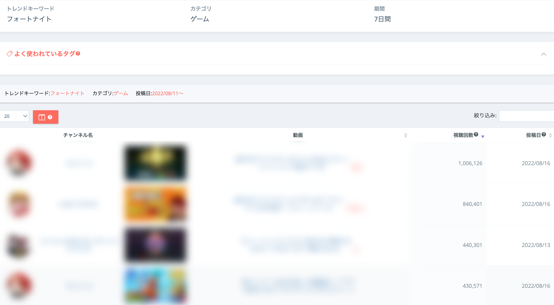 カテゴリや集計期間で動画を絞ることができ、そこからYouTubeで流行っているキーワードを探し出す機能です。