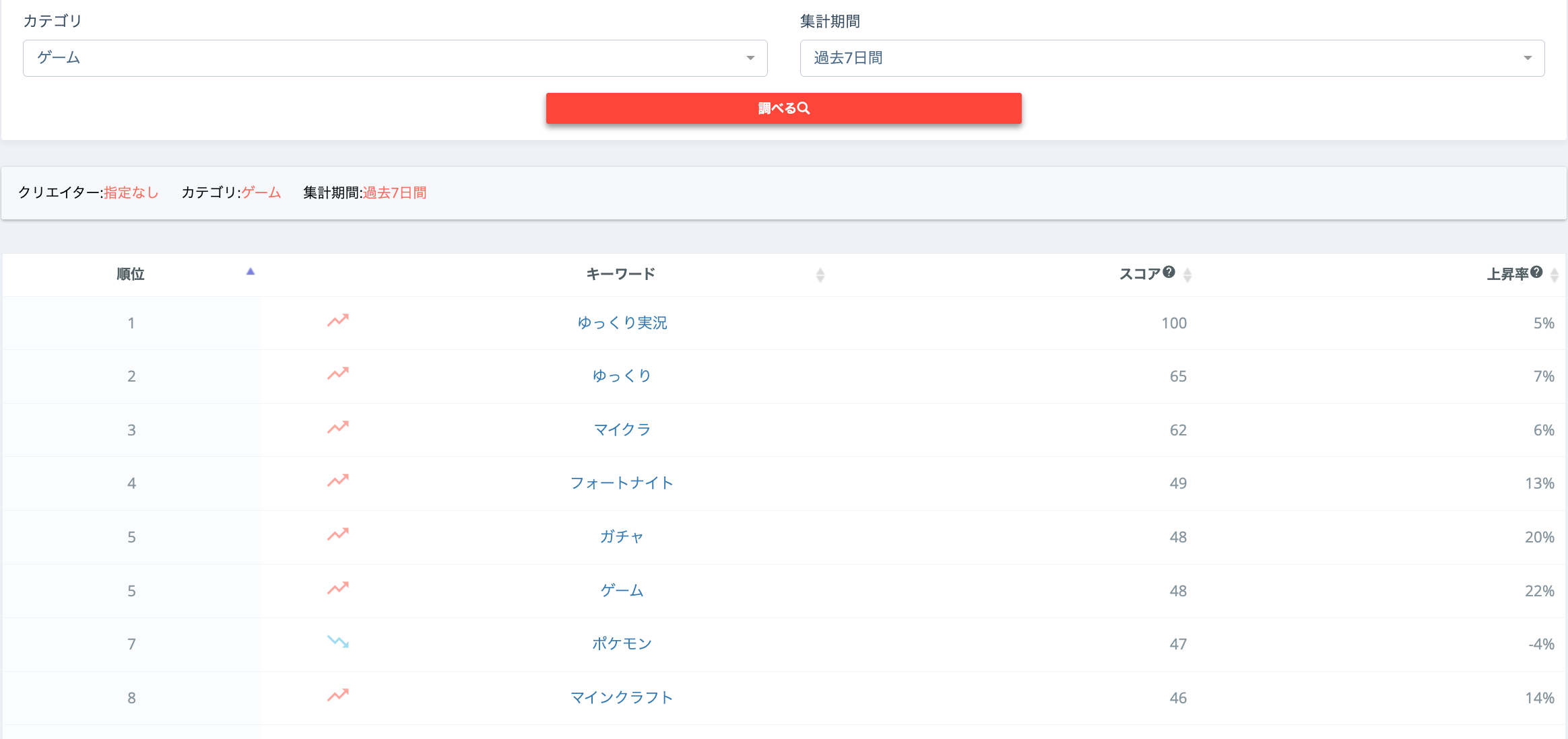 まずはカテゴリ、集計期間を絞っていきます。今回は「カテゴリ:ゲーム」、「集計期間:過去7日間」で検索していきます。結果は下のようになりました。