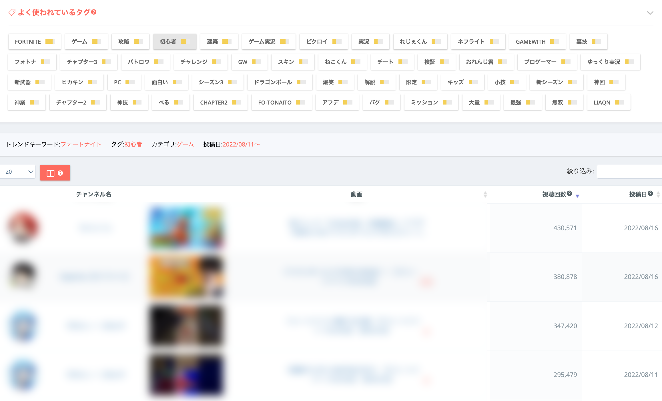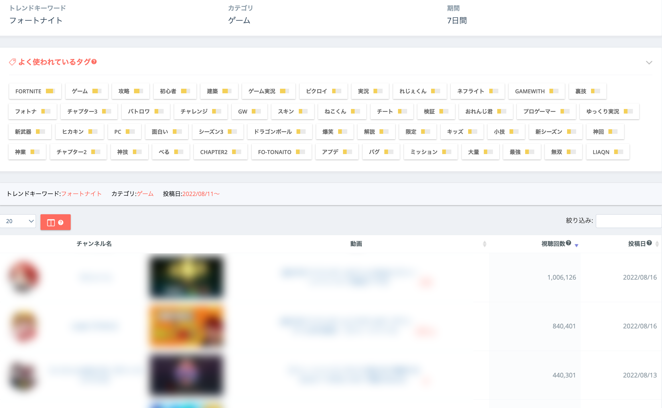 「フォートナイト」というキーワードを含む動画で最も使われているタグは「FORTNITE」、続いて「ゲーム」、「攻略」、「初心者」「ゲーム実況」といった順番になっています。