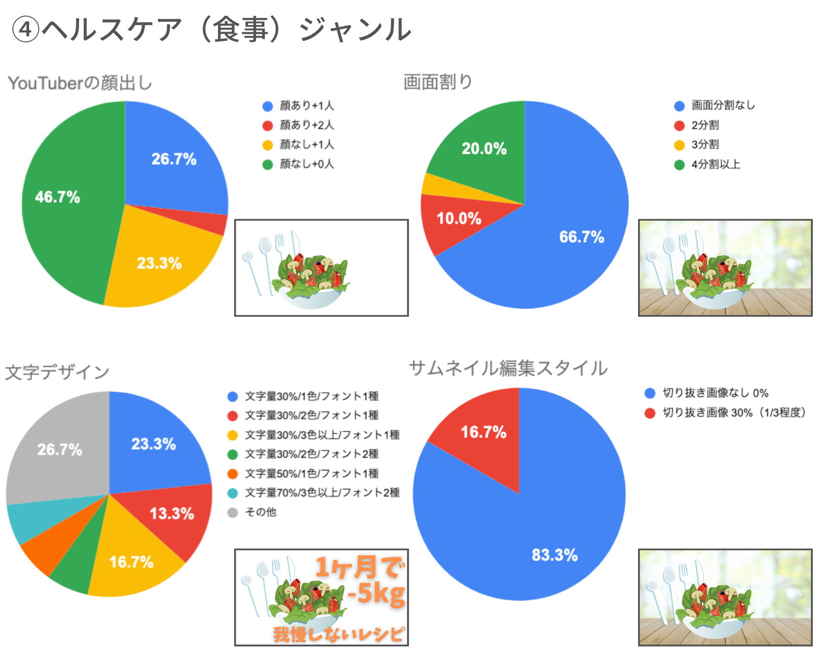 さらに、ヘルスケア(食事)ジャンルにおいてはYouTuberの顔出しは少なく食事にフォーカスした画像が多く使われていることがわかりました。これは前回の食品・料理カテゴリの調査と同様に「どんな食べ物なのか」という視聴者の関心が高い可能性が高いためだと考えられます。本ジャンルについては、食品のビジュアルを工夫して構成すると良いでしょう。