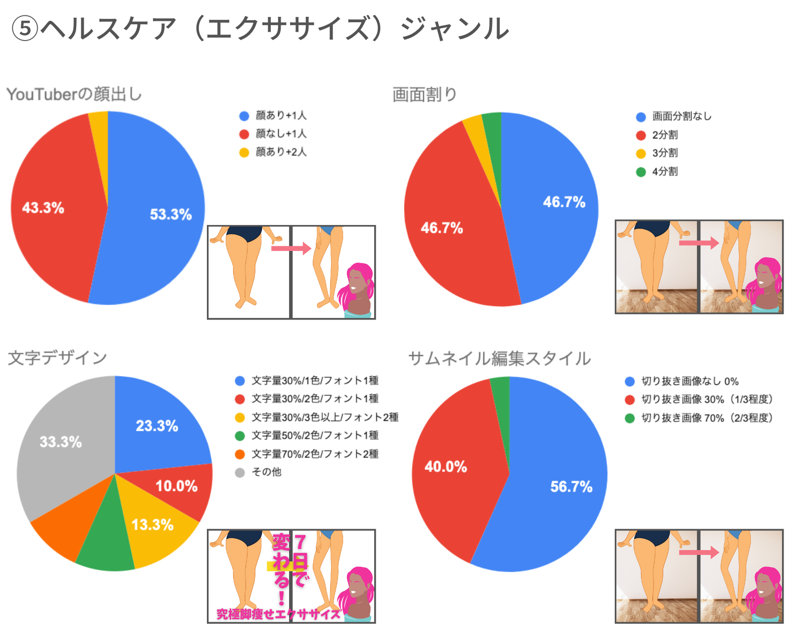 これは、ヘルスケア(エクササイズ)ジャンルにおいて「ストレッチや筋トレをしている様子」や「Before/Afterの構成の筋トレの様子」を知りたいという視聴者のニーズと、エクササイズの効果を見たいというニーズの2軸に応えていることからだと考えられます。