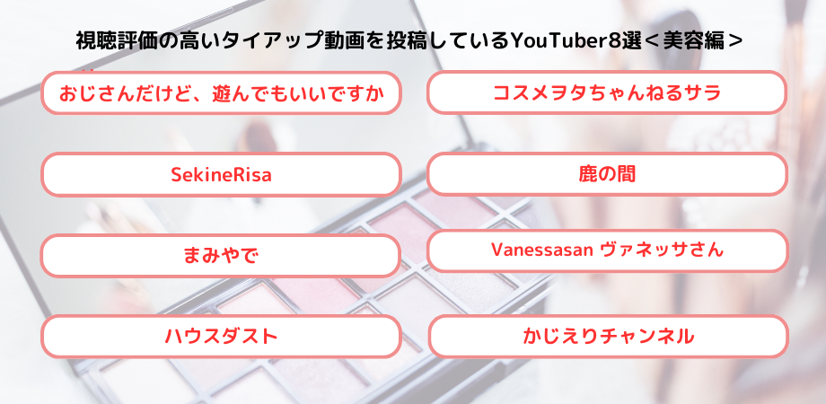 人気が集中するとタイアップの実施が難しい場合もあるので、美容カテゴリのチャンネルで絞り切らず、異なるカテゴリのYouTuberを起用してタイアップを実施することも一つの差別化を測る手段です。