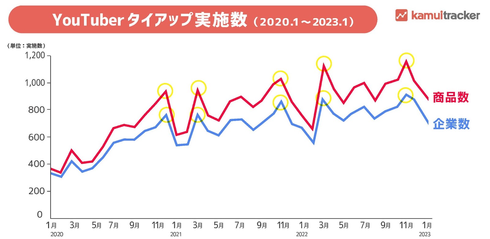 YouTuberタイアップの実施数は、2020年1月から2023年1月までの3年で約2倍以上になっています。月によって変動があるものの、全体的に見てYouTuberタイアップの実施数は増えています。