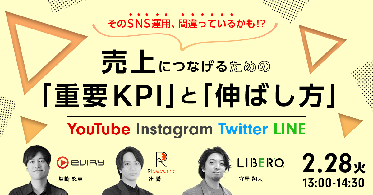 株式会社エビリー(本社:東京都渋谷区、代表取締役社長:中川恵介、以下エビリー)は、株式会社ライスカレー(本社:東京都渋谷区、代表取締役:大久保遼、以下ライスカレー)と株式会社ギブリー(本社:東京都渋谷区、代表取締役社長:井手高志、以下ギブリー)と共催で、2023年2月28日(火)に「<YouTube×Instagram×Twitter×LINE>そのSNS運用、間違っているかも!?売上につなげるための重要KPIと伸ばし方」と題した無料オンラインセミナーを開催いたします。