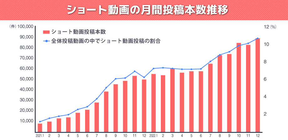 この2年でショート動画の月間投稿数はおよそ10倍になっており、YouTubeにおけるショート動画の重要度は高まってきています。