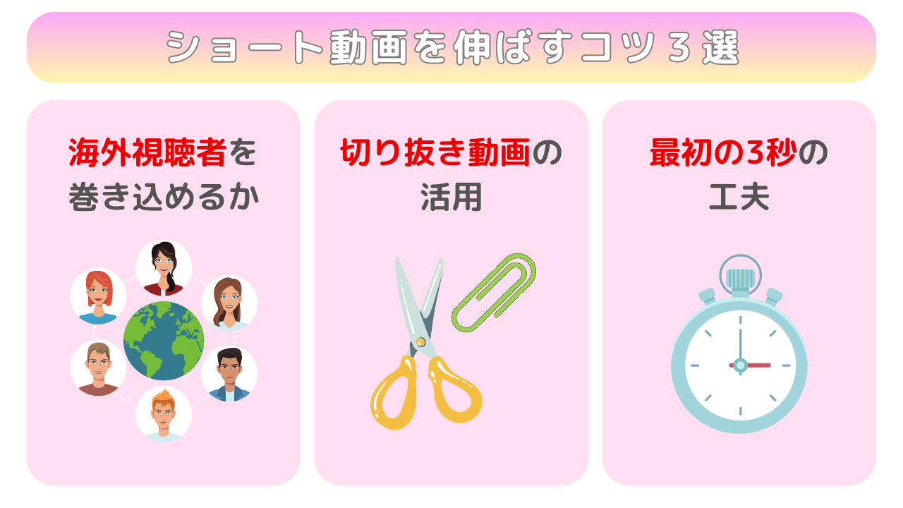 特にショート動画の特性上、離脱されないための冒頭コンテンツの工夫も必要になります。ショート動画での収益化を狙うのであれば、海外視聴者も巻き込む工夫、チャンネルに投稿している長尺動画へ促すのであれば、切り抜き動画の活用も行っていきましょう。