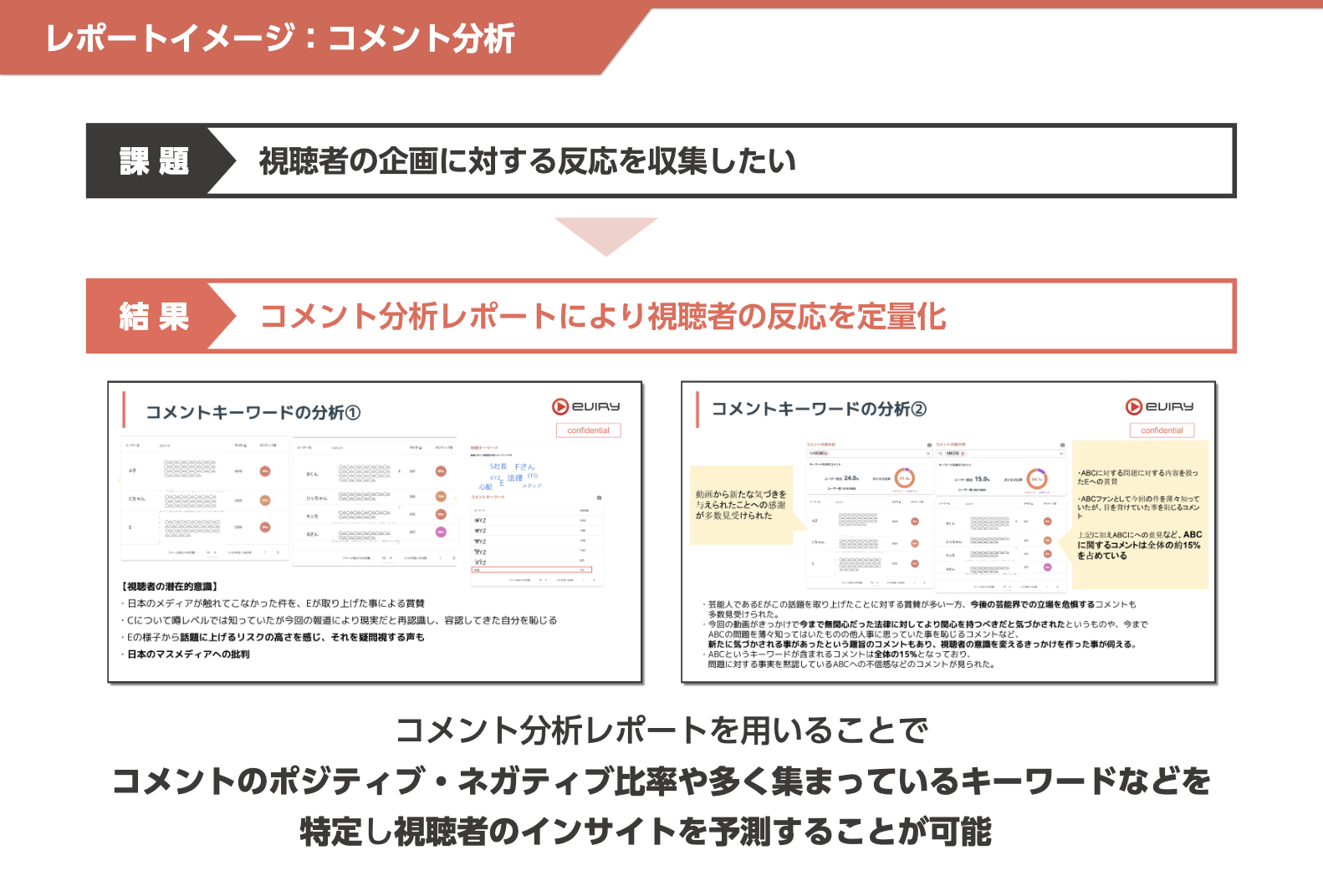 『kamui tracker』のコメント分析機能を利用した「コメント分析レポート」では、コメントのポジティブ・ネガティブ比率や動画に多く集まっているキーワードなどを特定し詳細を分析することで、視聴者の企画に対する反応を定量化することが可能です。