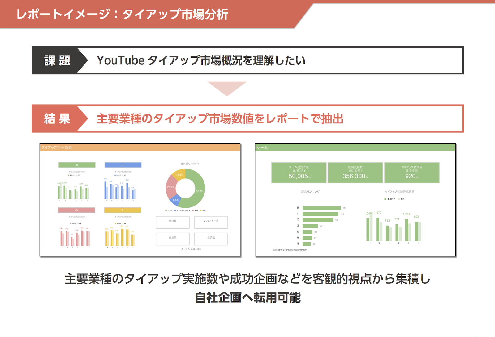 各業種のYouTuberタイアップ案件実施数や、視聴回数が伸びていて実際に認知拡大や購買に繋がっている企画などのデータを集積し、運用するYouTubeチャンネル企画へ転用が可能です。また、現在のYouTubeタイアップ市場概況を理解したいというニーズをお持ちの方にもおすすめです。