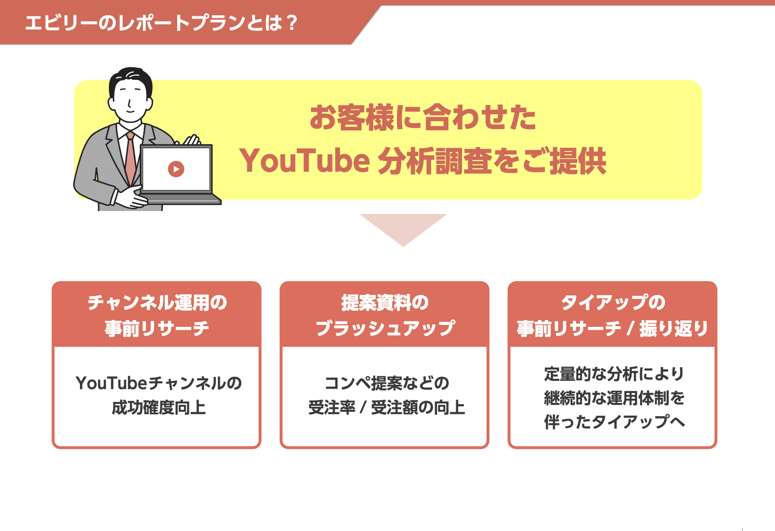 株式会社エビリー(本社:東京都渋谷区、代表取締役社長:中川恵介、以下エビリー)は、YouTubeマーケティングを効率よく加速させるための、データドリブンなレポートの作成に特化した「YouTube分析レポートプラン」の提供を開始しました。本プランでは、国内最大級のYouTubeデータ分析ツール『kamui tracker(カムイトラッカー)』を活用します。
