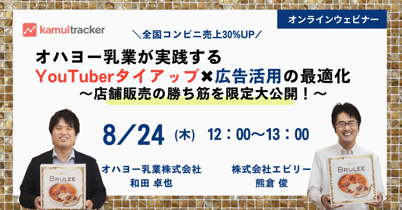 株式会社エビリー(本社:東京都渋谷区、代表取締役社長:中川恵介、以下エビリー)は、オハヨー乳業株式会社(本社:岡山県岡山市、代表取締役社長:野津基弘、以下オハヨー乳業)と共催で、2023年8月24日(木)に「オハヨー乳業が実践するYouTuberタイアップ×広告活用の最適化〜店舗販売の勝ち筋を限定大公開!〜」と題した無料オンラインセミナーを開催いたします。