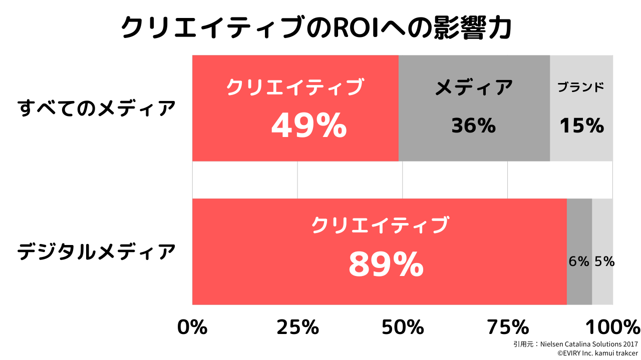 また、これは広告全体における割合であり、優れたクリエイティブをもつデジタル広告の場合、クリエイティブの売上貢献度は89%にものぼる調査結果が出ています。