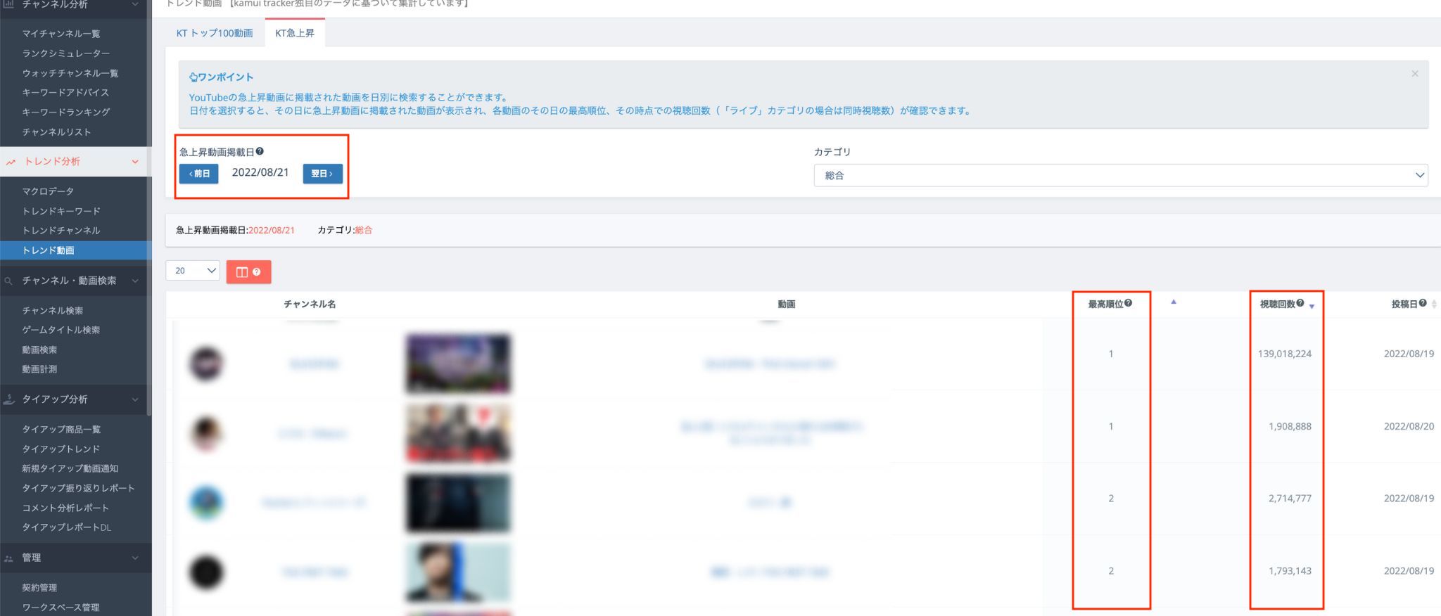 日付を選択するとその日に急上昇に掲載された動画が表示され、各動画のその日の最高順位、その時点の視聴回数を一覧で確認できます。