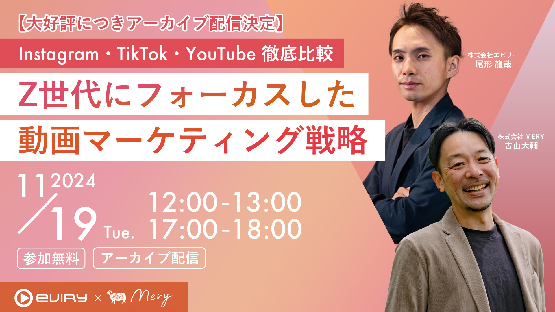 今回は、“Z世代“にフォーカスした効果的なブランドコミュニケーション及びプロモーションをサポートを行うMERYと、ビッグデータをもとに各世代のYouTube利用傾向を分析し運用支援を行うエビリーの共催でウェビナーを開催することになりました!