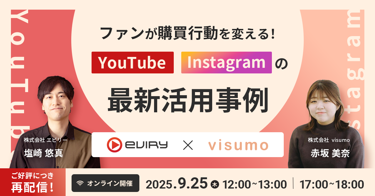 今回はInstagram連携UGC活用ツールを提供するvisumo社と、YouTubeデータ分析ツールを提供するエビリー社で共催セミナーを行います。それぞれの媒体で「ファン形成を起点とした購買促進」をどのように実現しているのか、その手法だけでなく事例を徹底紹介いたします。