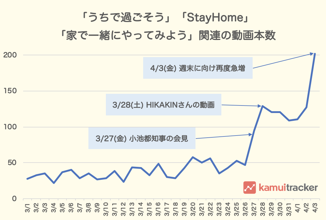・「うちで過ごそう」「StayHome」「家で一緒にやってみよう」のいずれかのキーワードが動画タイトルまたはタグに含まれている動画の本数を日別に集計した
