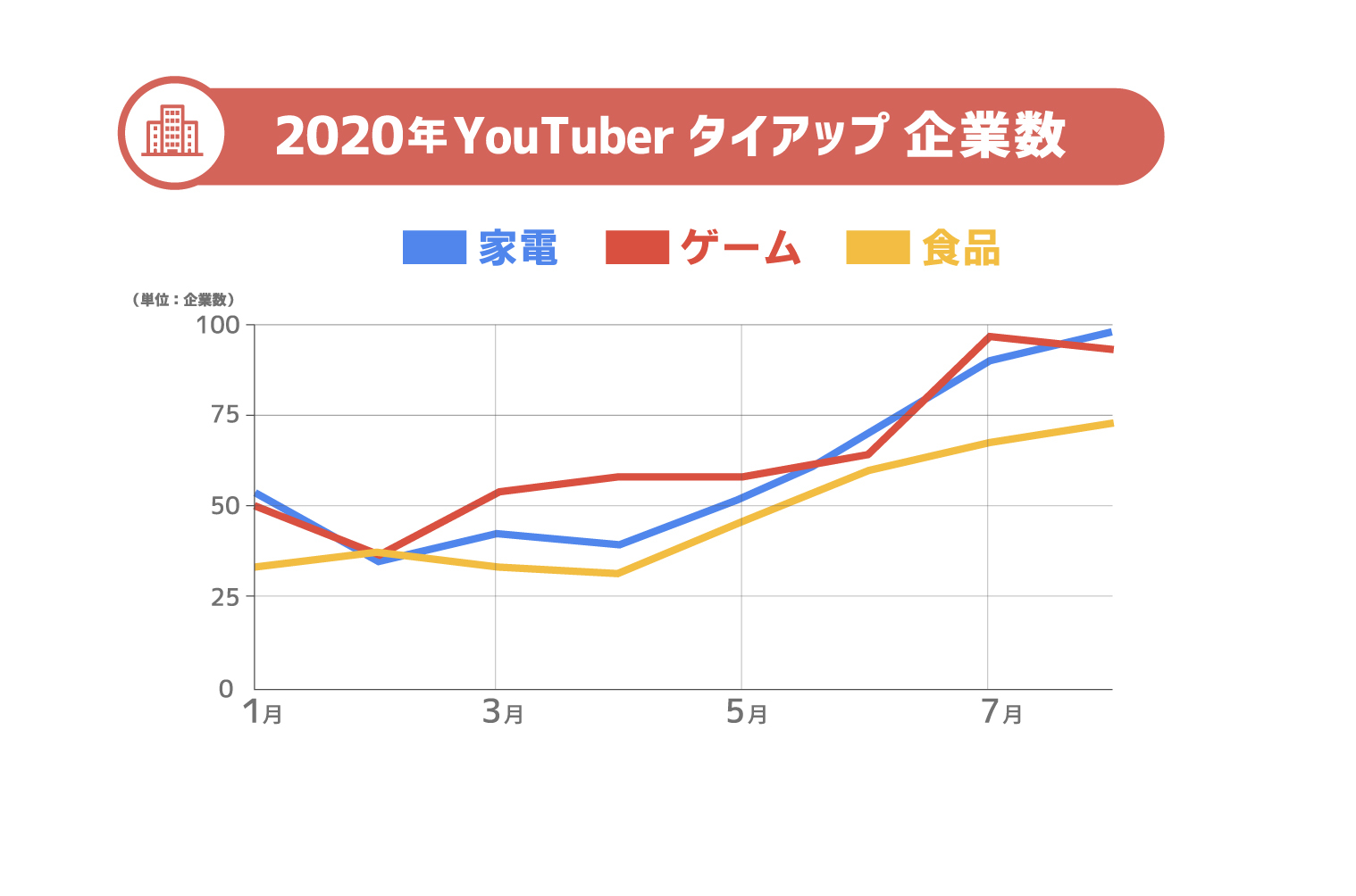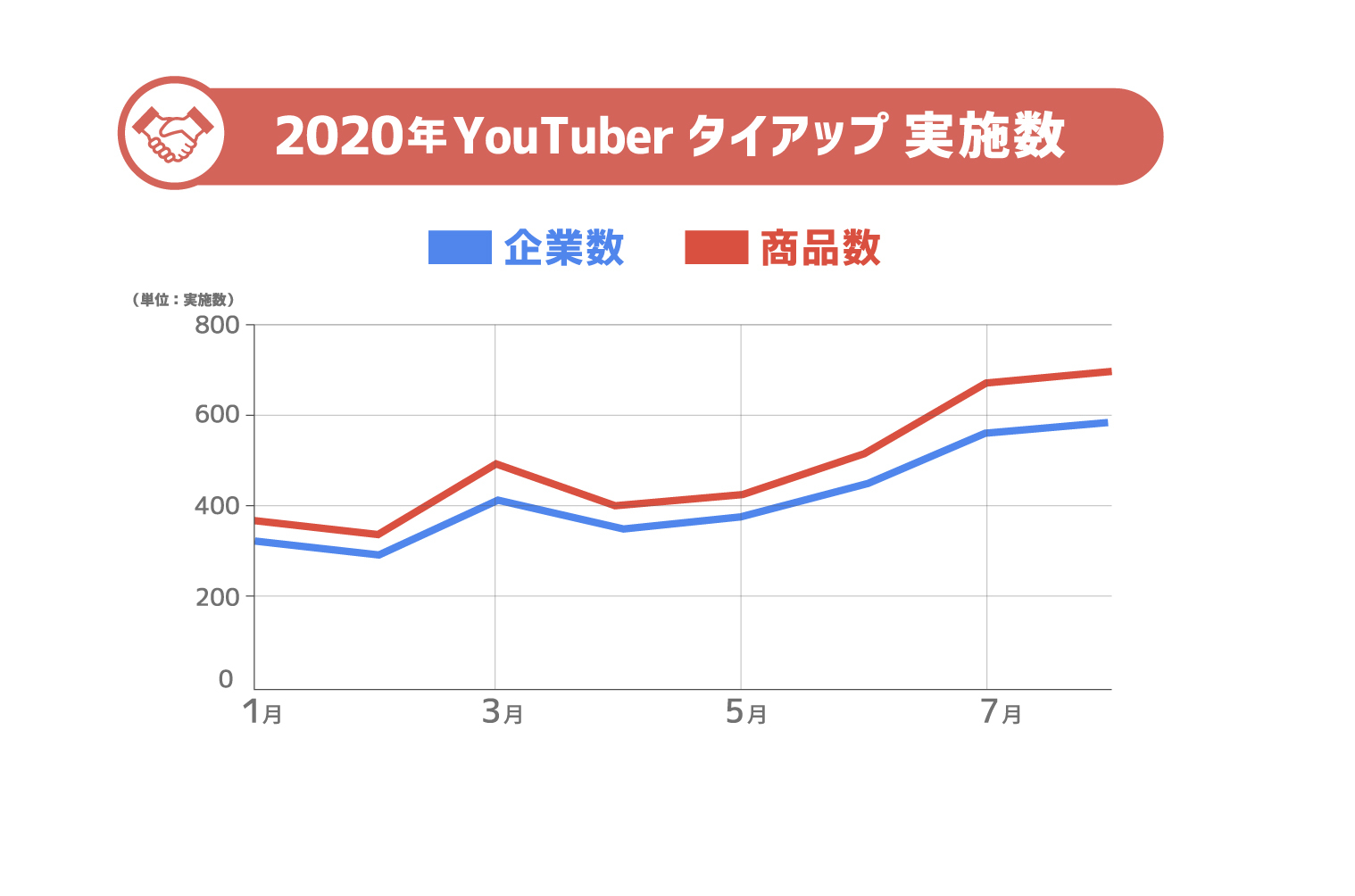 また、2020年の月別で見ても、コロナ禍以降も実施数は増加しており、YouTuberタイアップがプロモーションの手法として存在感を増していることがうかがえます。
