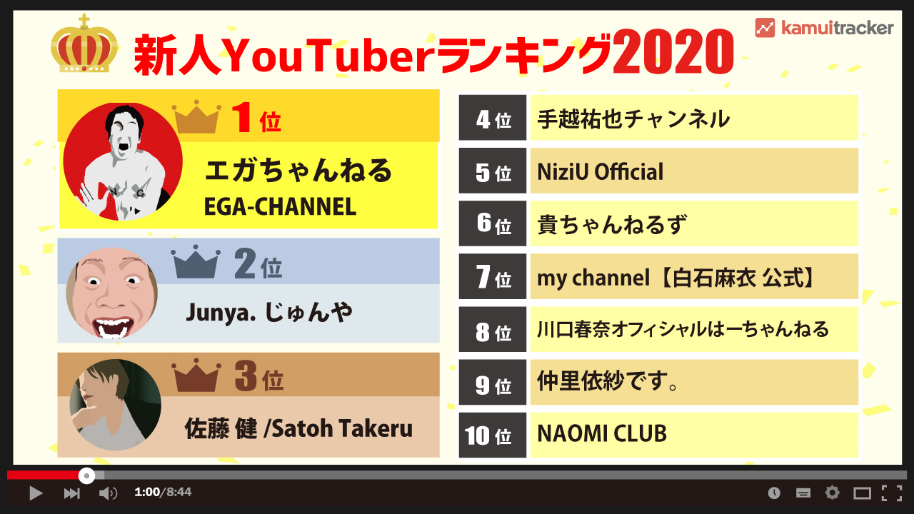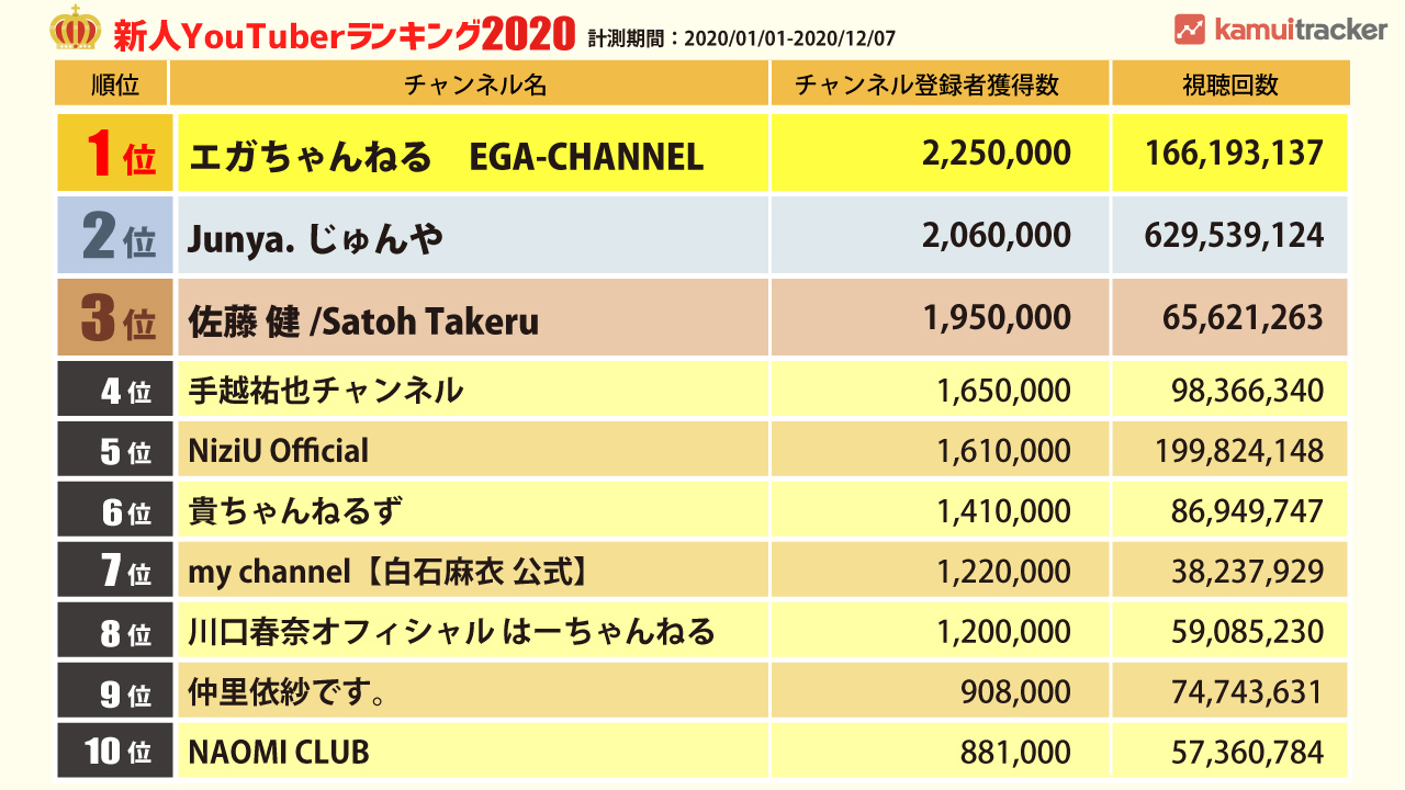 このランキングは、kamui trackerで独自に集計したデータを用い、2020年にYouTubeチャンネルを開設した「新人」の中で最も多くチャンネル登録者を獲得したチャンネルをランキングにしたものです。