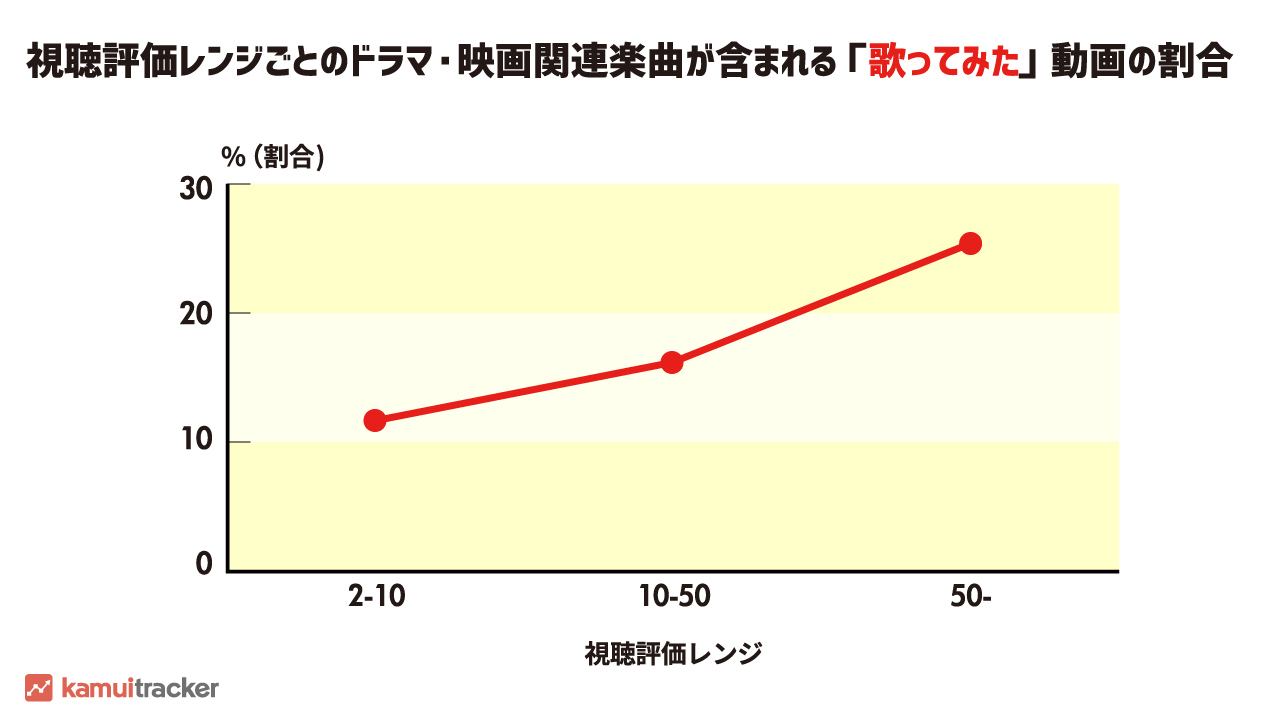 調査からは、高い視聴評価レンジには、ドラマや映画で用いられている楽曲の動画の割合が高いことがわかります。