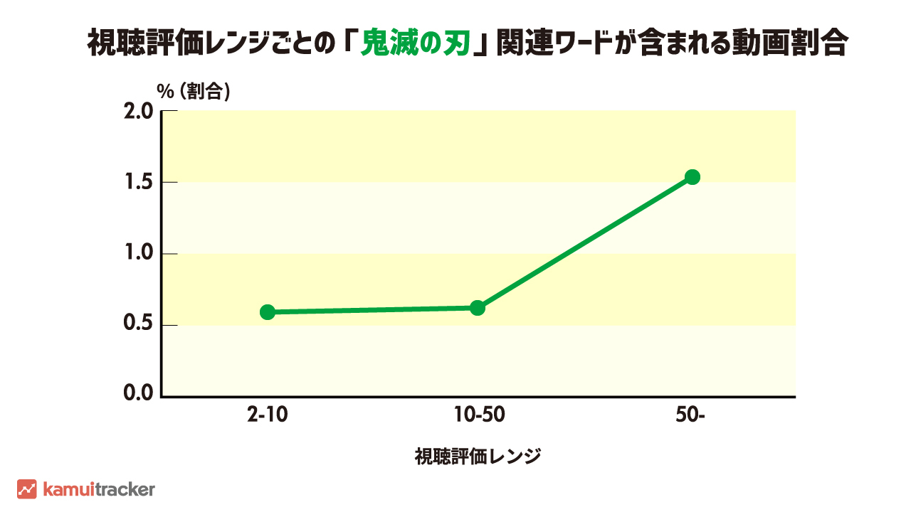グラフを見ると、高い視聴評価レンジになるほど「鬼滅の刃」関連ワードが含まれる動画の割合が高くなり、視聴評価50以上のレンジでは急激に高まっていることがわかります。