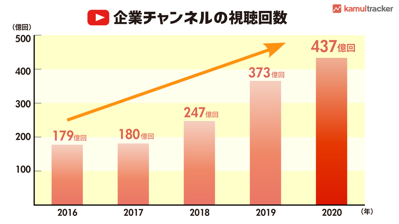 2016年〜2020年にかけて企業チャンネルの視聴回数は右肩上がりになっており、2020年は前年比117%になっています。
