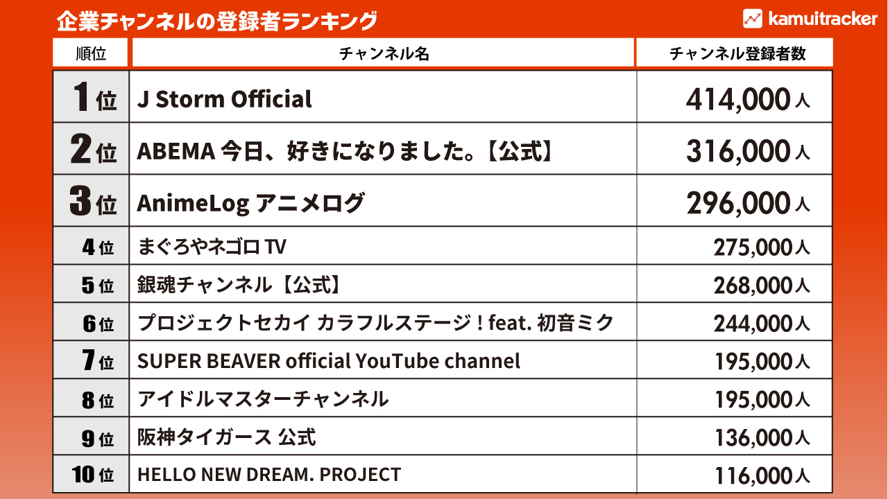 企業チャンネルランキングの1位に輝いたのは、チャンネル登録者を41万人以上獲得した「J Storm Official」でした。2位は「ABEMA 今日、好きになりました。【公式】」で、3位は「AnimeLog アニメログ」でした。