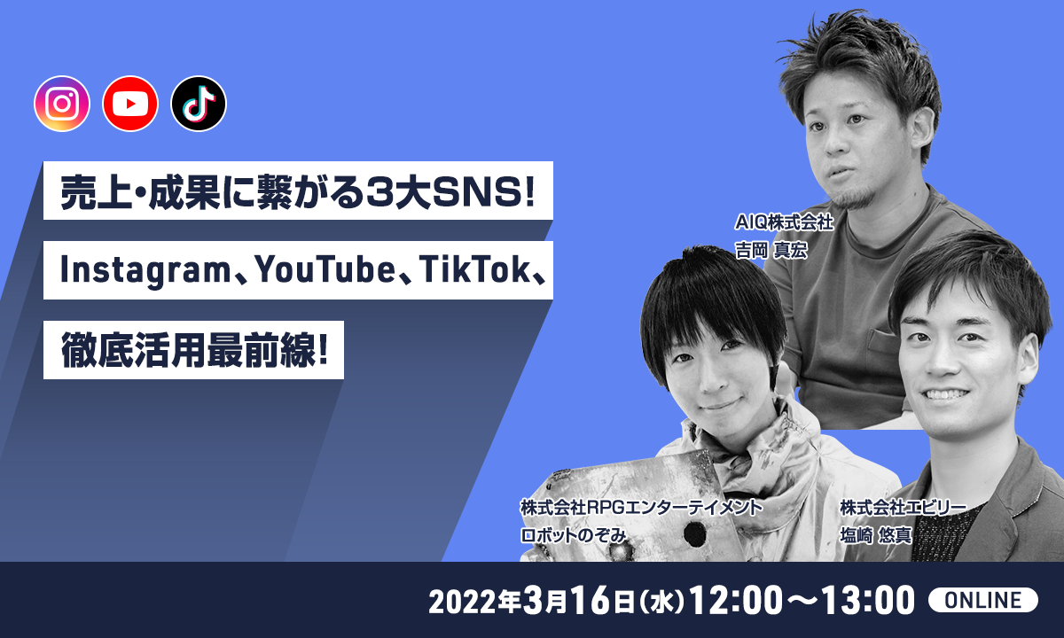 株式会社エビリー(本社:東京都渋谷区、代表取締役社長:中川恵介、以下エビリー)は、AIQ株式会社(本社:東京都新宿区、代表取締役社長:高松睦、以下AIQ)と株式会社RPGエンターテイメント(本社:東京都世田谷区、代表:杉浦希介(ロボットのぞみ)、以下RPGエンターテイメント)と共催セミナーを開催することを決定しました。2022年3月16日(水)に「売上・成果に繋がる3大SNS!