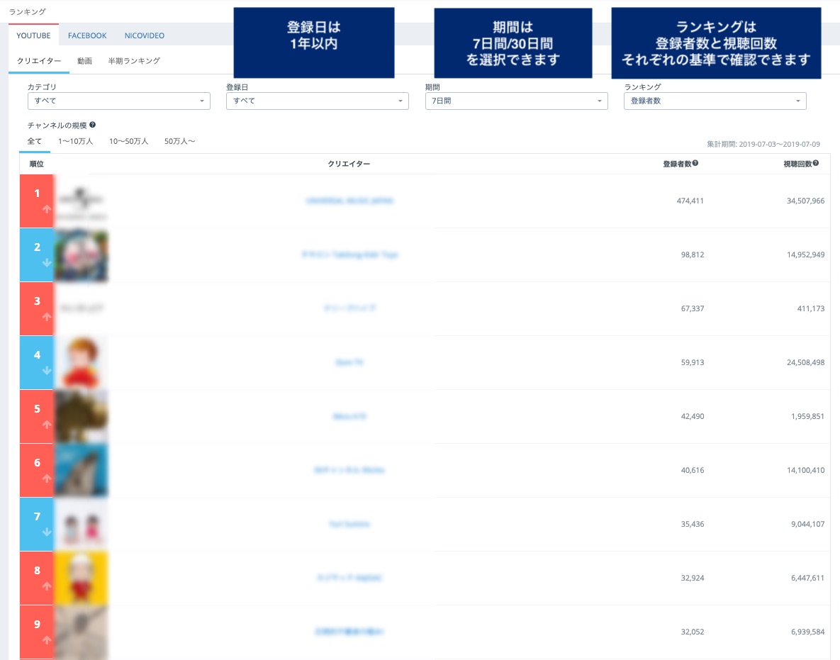 この機能は、「カテゴリ」「投稿日」「期間」などを選択し、人気のクリエイターや伸びているクリエイターを探すことができます。