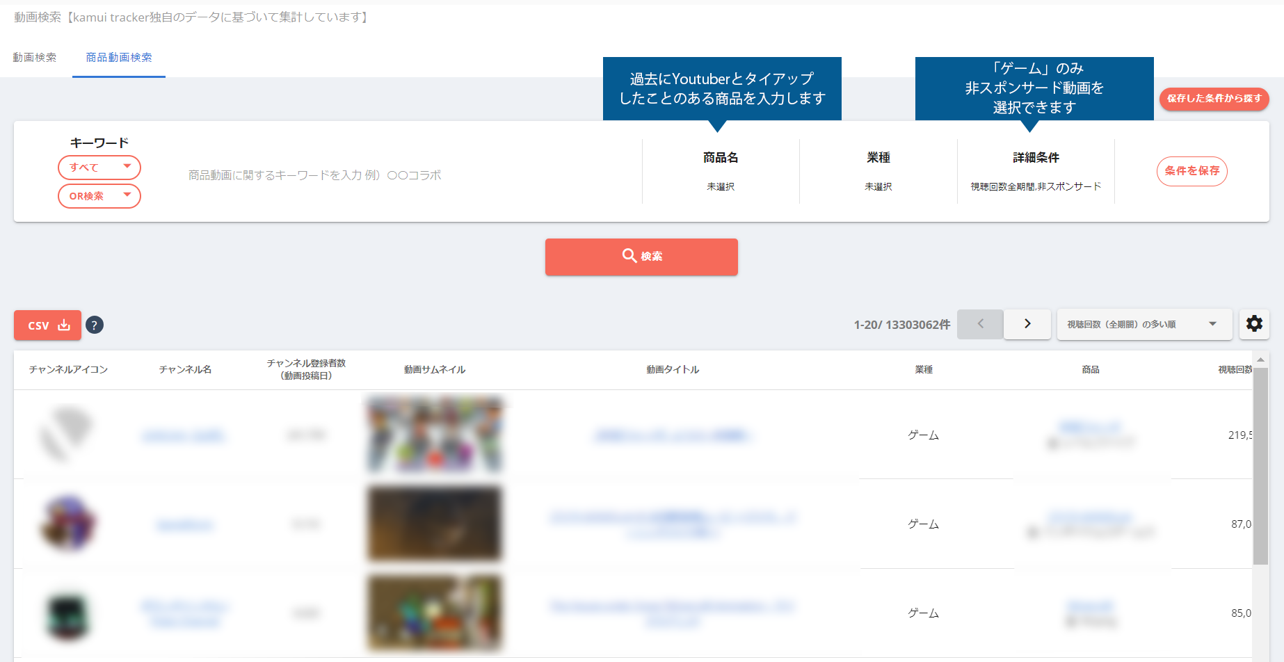 商品動画検索機能では、企業とYouTuberのタイアップ動画を検索することができます。