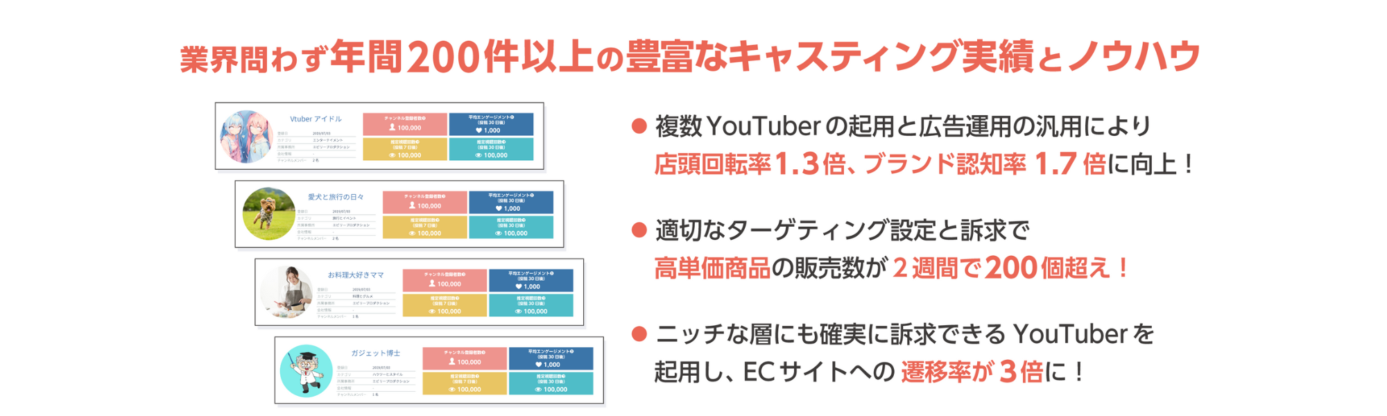 「自社所属のYouTuberを優先的に提案する」ということがなく、案件ごとに最も結果が見込めるYouTuberを、幅広い選択肢からデータに基づいてご提案しています。