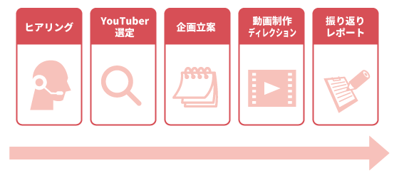 「そもそもYouTuberキャスティングの方法がわからない」「費用や相場感がわからない」という初めてのYouTube施策でもご安心ください。費用相場感のご説明からYouTuber選定、企画立案、YouTuberとの交渉、動画制作ディレクション、振り返りレポートの作成など、すべての工程を当社が実施いたします。